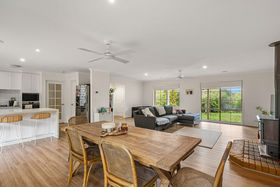 Stepping inside, you're immediately welcomed by a light-filled open plan living space where light-coloured floorboards flow throughout, creating a fresh and inviting feel. The living area centres around a cosy fireplace, making it a place the whole family will naturally gather during the cooler months. Large windows allow natural light to pour in while also framing views out toward the backyard.